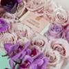 This deluxe gift box includes delicious pecan caramel popcorn, bubbly champagne gummy bears, and four delicious macaroons in a 14"x14" box nestled among flowers. Blooms include blush roses, fuchsia mini orchids, dark purple anemones, and lavender roses.