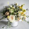 Designed in a modern white ceramic vessel, this garden-style arrangement features a curated blend of buttery garden roses, creamy ivory blooms, delicate yellow accents, and seasonal specialty florals, thoughtfully layered with airy greenery and gentle draping foliage. The color palette is light, natural, and refined—bringing a sense of calm elegance and organic movement to any space.
