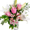 quadrangle beauty consist of lilies, pink roses and alstroemeria