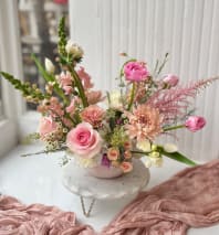 A bouquet made with delicate blooms in various shades of pink, white, and yellow accents, announcing the arrival of spring.