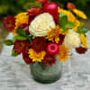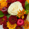 A delightful nod to the harvest season! This arrangement features a vibrant mix of deep red and golden yellow mums, creamy white roses, and fresh greenery, all beautifully arranged in a sleek glass vase. To add a fun seasonal touch, the bouquet is adorned with decorative red apples, making it the perfect centerpiece for any autumn celebration.