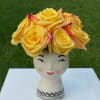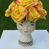 A vibrant and cheerful arrangement featuring a cluster of sun-kissed yellow roses, accented with subtle hints of pink for a touch of warmth. These blooms are nestled in a unique ceramic vase shaped like a charming woman's head, adding a playful and artistic touch to the design. This bouquet is perfect for brightening up any space and bringing a sense of joy and optimism.