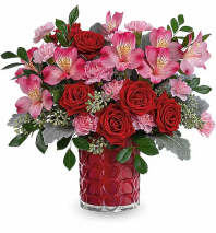 Indulge in soft, pastel shimmer with our iridescent mosaic glass cylinder, radiating elegance and charm, perfectly complemented by a bouquet of pink roses, crème spray roses, pink alstroemeria, hot pink miniature carnations, lavender button spray chrysanthemums, large purple monte cassino asters, dusty miller, and huckleberry for an enchanting Mother's Day gift.