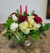 Christmas centerpiece long and low suitable for you and your Christmas celebration. this beautiful centerpiece made with fragrant burgundy & white roses and spray rose, beautiful burgundy and green cymbidiums orchids green, red anthurium, white hydrangea, and Christmas greens decorated with 2 red candles, bulbs and red velvet ribbon