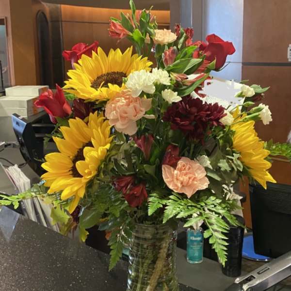 My flowers were beautiful with the slightest touch of blue that was just right. Thank you so much, and the other flowers that were delivered for our service were gorgeous as well. The sunflowers were amazing. And thank you also, very much, for the beautiful plant. Your kindness is very much appreciated!!