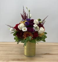 A combination of fall color flowers like ranunculus, chrysanthemum, and rose, in a tall glass vase covered with gold ribbon. This arrangement is a perfect thanksgiving or Christmas gift for your everyone.