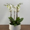 This elegant Orchid arrangement includes three double- stem plants( 6 stems totally) in a round large ceramic pot. It would be a graet gift for any occasion. The measurements of the arrangement are: 28" tall , 13" diameter. Choose a color of your choice! For the delux version we decorate the stems with moss and for the premium version we dress up the orchid with curly willow or pussy willow.