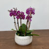A mini orchid party! Three double spike 9" mini orchid plants are arranged in a white ceramic pot. Currently available in pink, white, and purple. Please state your preferred color in the "special instructions" section during checkout.