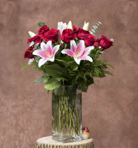 Love's divine, and roses are too. This beautiful mix of red and white roses - accented with Queen Anne's Lace, and adorned with a bold red ribbon - is a timeless gift for your beloved.