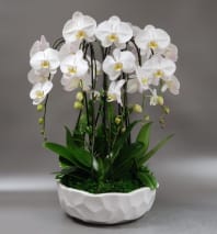 Four large white blooming stems in a smooth white modern decor vessel topped with fresh moss. This sleek and elegant arrangement makes a bold statement piece.