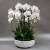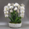 Elegant arrangement with 6 white cascading orchid stems, ZZ plant, natural accents, in a white designer vessel.