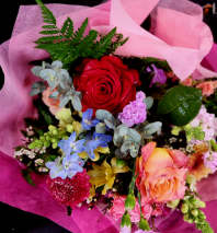 Feminine, Romantic and Pure bliss! The bouquet is wrapped in pink ruffled wrapping yarn and paper but can be placed in a vase at your request, please call or specify in the special instructions. Premium will include either Garden roses, Dahlias or Peonies.