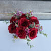 Glittered red roses with greenery and pink waxflower in a white and gold vase