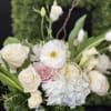 Mixture of white and creamy flowers arranged bespoke style in floral foam structured container by Charlene