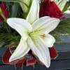 Seasonal designed arrangement in a vase with fresh assorted christmas greens, fresh cut flowers and a ribbon