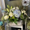 white, blue, and green flowers arrange in a wooden box. Hydrangeas, lily, roses and more
