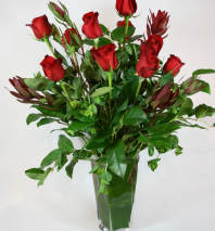 18 Beautiful red roses in a contemporary glass vase accented with grass loops and succulents.