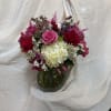 An arrangement in a glass vase of alstroemeria, statice, roses, snapdragons, lilacs, hydrangeas, mums, and greens.