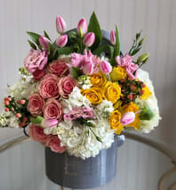 This Chocolato arrangement is made with pink and purple roses, spray roses, licentious, greenery and lush white hydrangeas. The arrangement comes in a pink round box.
