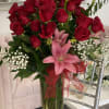 24 long stem roses, Lilies, Baby’s Breath with lush Greens and large red ribbon, in a tall elegant clear glass vase, this will surely impress
