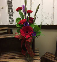 This beautiful arrangement is filled with elegant red flowers, berries, and lush holiday greens.