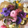 Seasonal, colorful flowers and foliage artfully arranged, wrapped in tissue and ready to drop in a vase at home.