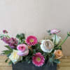 Seasonal, colorful flowers and foliage arranged in a rectangular wooden vase.