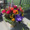 This beautiful arrangement has gorgeous colors and the combination of colors is awe-inspiring it has sunflowers, hot pink roses, purple orchid, white tulips, Lilys, delphinium, spray roses, orange roses, stock and fresh greens.
