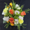 A bright and cheerful arrangement inspired by warm sunset tones. Featuring vibrant orange and yellow roses, soft white blooms, and fresh textured greenery, this bouquet brings energy and joy to any room. Perfect for celebrations, uplifting gifts, or sending a sunny message to someone special.