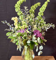 This lush, garden-inspired arrangement is a celebration of texture, color, and natural movement. Designed in a classic pedestal vase, it features an abundant mix of seasonal blooms, soft hydrangea, airy delphinium, delicate daisy-like flowers, and romantic stock, layered with wisps of waxflower and fresh greenery. Cascading amaranthus adds an elegant trailing touch, while varied heights and tones create a graceful, meadow-like silhouette. Full, expressive, and artfully arranged, this piece makes a stunning statement for celebrations, heartfelt gestures, or simply bringing beauty into any space.