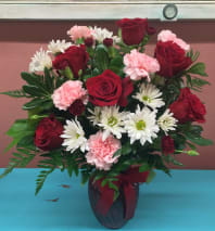 A charming blend of classic romance and fresh elegance, this Valentine’s Day arrangement features lush roses paired with cheerful daisies, delicate alstroemeria, fragrant stock, and airy eucalyptus. Designed to feel both timeless and joyful, it’s the perfect way to say, “I love you,” “I’m thinking of you,” or “you make my heart happy."