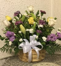 Magnificent sympathy floral arrangement that stuns and is perfect when a smaller arrangement just will not show how much we love you. 30" tall with a large number of flowers of various kinds. Contains roses lilies, carnations, and other seasonal flowers