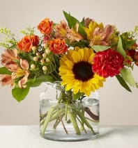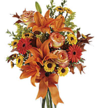 Bring the fall festivities indoors with the Apple Picking Bouquet, a delicious mix of roses, mums, and solidago expertly arranged in a mason jar capturing the beauty of the season.