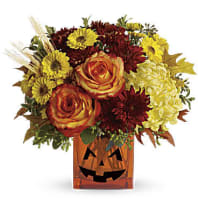 Breathe in the change of seasons with this alluring blend of oranges and reds, featuring standout stems like lilies, roses and mums.