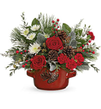 Perfect for any holiday occasion this centerpiece will light up any event. This lovely centerpiece comes with 2 red candles plaid ribbon, green poms, red carnations and roses, accented with pinecones.