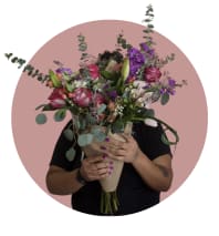 This traditional design is a mix of fresh and premium, seasonal flowers in the color scheme of pink and purple, wrapped with paper. This arrangement will be made up of the same look, color, and feel but use different flowers based on the season.