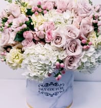Roses and various greens are placed throughout this breathtaking arrangement! A box full of love and tenderness!