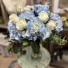 A beautifully arranged vase filled with Blue Hydrangeas and mixed greens (vase size and shape will vary)