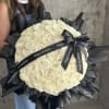A Chic bouquet with 99 premium long stem milky white roses, fancy black wrap. Birthday bow ribbon. Photo is Deluxe size 50 roses. Standard is 25 roses. Premium 75 roses