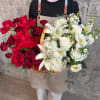 A striking hand crafted basket that blends bold red with soft white blooms, a modern take on contrast, balance, and timeless beauty.