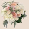 Graceful and romantic, the Soft Meadow bouquet blends delicate blush and peach tones with airy greenery for a naturally elegant look. This rounded garden-style bouquet features lush white hydrangea as a soft foundation, layered with blush spray roses and classic ivory and soft peach roses. The combination of full hydrangea and delicate roses creates a beautifully balanced arrangement with depth and softness.