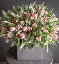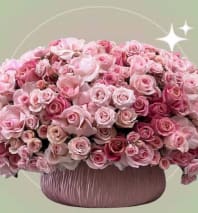 A charming blush pink floral arrangement featuring roses, lisianthus, tulips, spray roses, and hydrangeas accented with fresh greenery. This lush garden-style bouquet creates a soft, elegant look that’s perfect for birthdays, celebrations, or brightening any space.