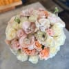 A beautiful selection of soft colored roses in a gorgeous 'misty blue" ceramic container
