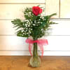Hot pink rose, baby's breath and greens in a glass bud vase. Hot pink organza bow