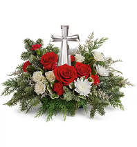 Red carnations, white carnations, miniature red carnations and silver lace dusty miller are accented with noble fir and white pine. Delivered in a Snow What Fun Sleigh Keepsake
