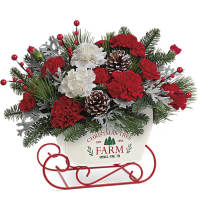The crystal cross is nestled elegantly among red and white blooms, this keepsake brings joy and light to your special occasion. Red roses, white spray roses, red miniature carnations, white cushion spray chrysanthemums are adorned with white limonium, varigated pittosporum, noble fir, and cedar. Delivered with a Crystal Cross Keepsake.