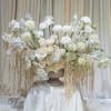This arrangement is a vision of ethereal elegance and soft luxury. Creamy white and blush-toned blooms—roses, ranunculus, and delicate seasonal florals—create a cloud-like centerpiece full of texture and romance. Cascading strands of soft amaranthus add graceful movement, giving the piece a dreamy, draped silhouette. Set in a classic pedestal vase, this design feels airy, sophisticated, and timeless.