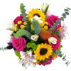Regality and innocence come to mind with this bouquet of hydrangeas, pink floyd roses, sunflowers, pink lilies, pincusion protea, buttons, and other seasonal blooms.