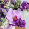 Beautiful arrangement of fresh flowers in shades of purple, lavender and white, in a gorgeous basket, that every Mom will love