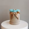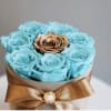 Vivid aqua preserved roses designed to last 3 or more years form a stunning base for a single metallic gold rose centerpiece. Housed in a champagne velvet hatbox with gold ribbon, this natural long-lasting piece shines with bold sophistication.